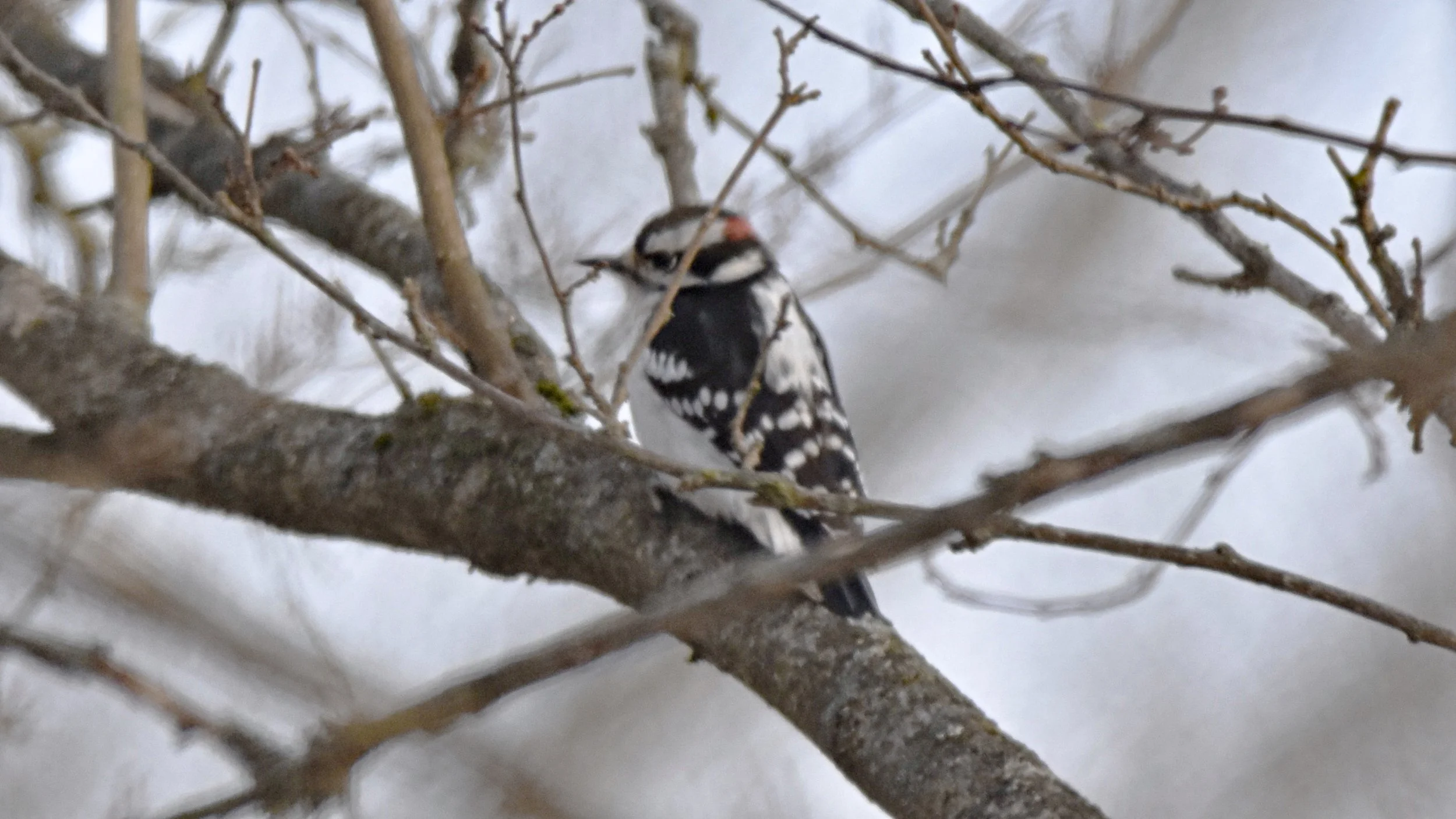 Saw this Downy Woodpecker searching for a snack. If you were not looking you may not see him.