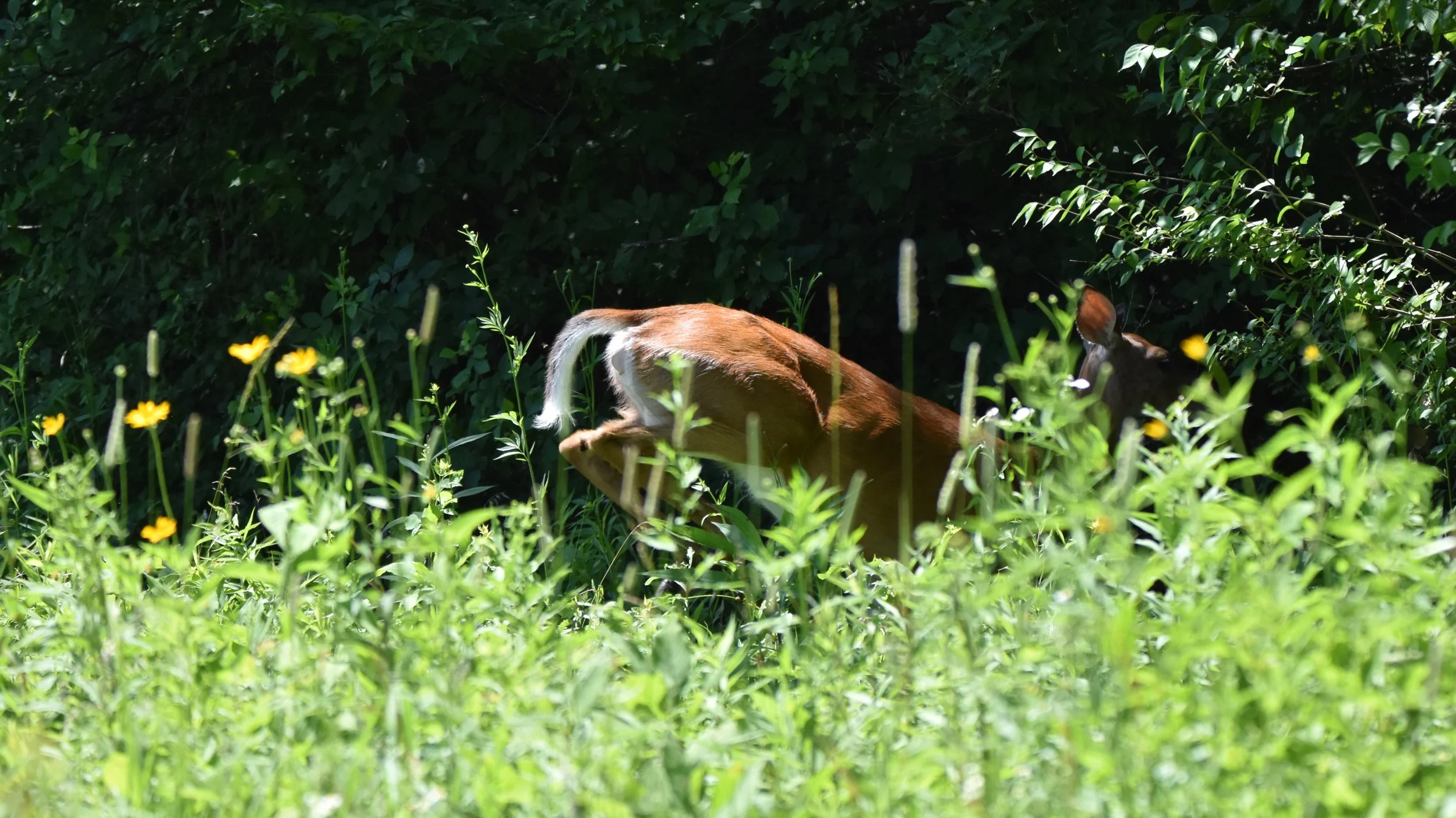 This deer was a surprised as we were. She was hiding in this bush ... I noticed something move as we walked by. We were only 10 feet away, but it became more than she could take, so she ran out the back side of the bush. Once she cleared away from the foliage, she looked back to see what we were doing. I captured this photo. Shortly after that she took off, as did a second deer that I had not noticed.