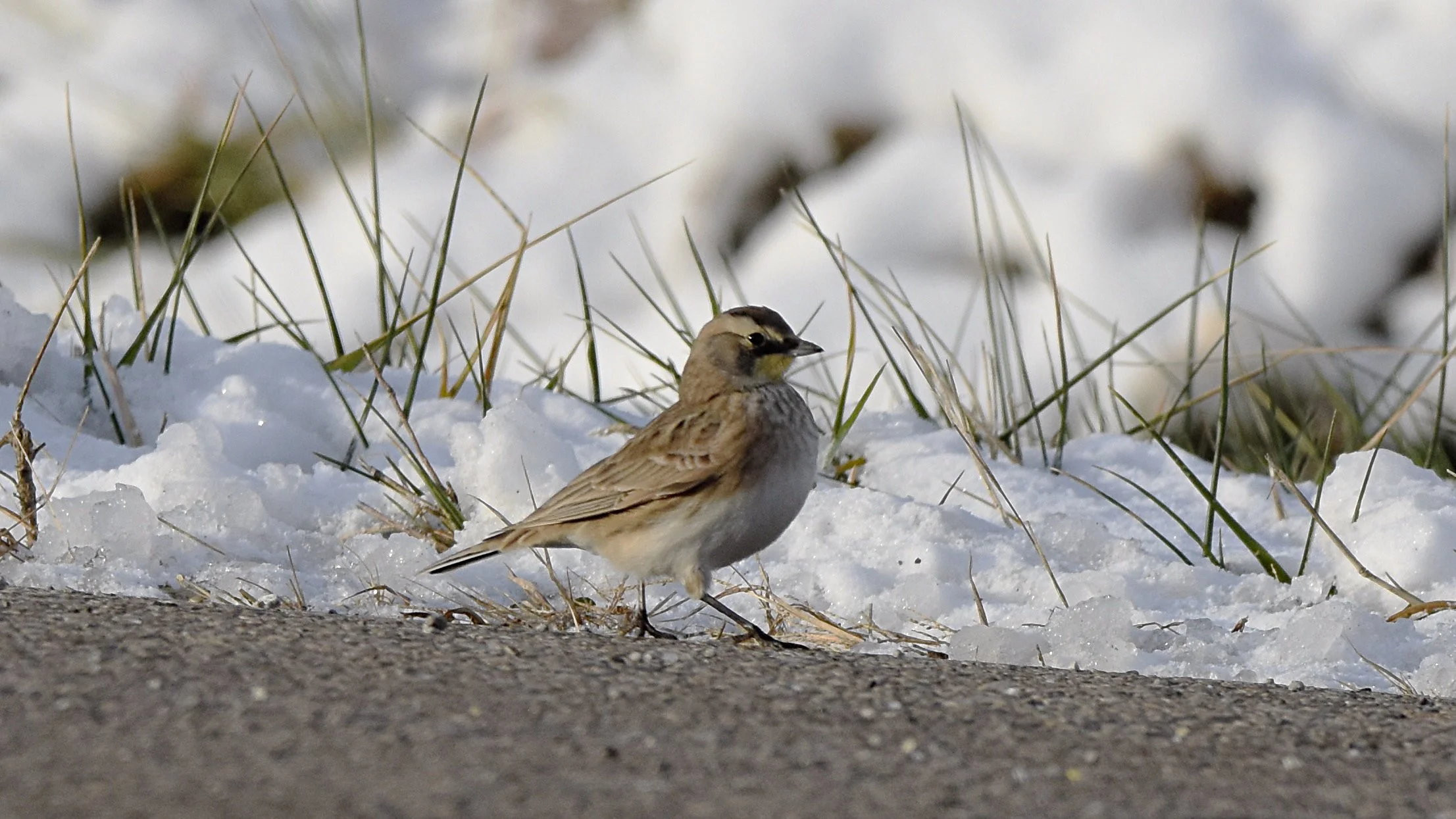 This is a female Horned Lark. I wish I could photograph a male. The male has the horns .. see the link. THey are a very cool looking bird.