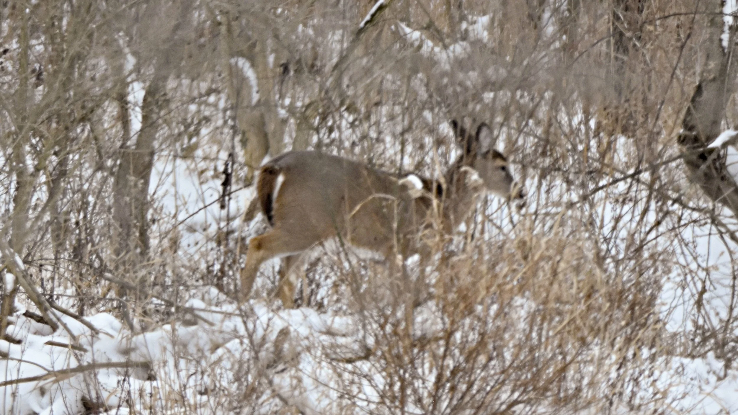 You cannot see it in this picture but the fishing pond between the deer and me was frozen over. I don't think it was very thick. This deer was walking on it and I was worried she make go through it.
