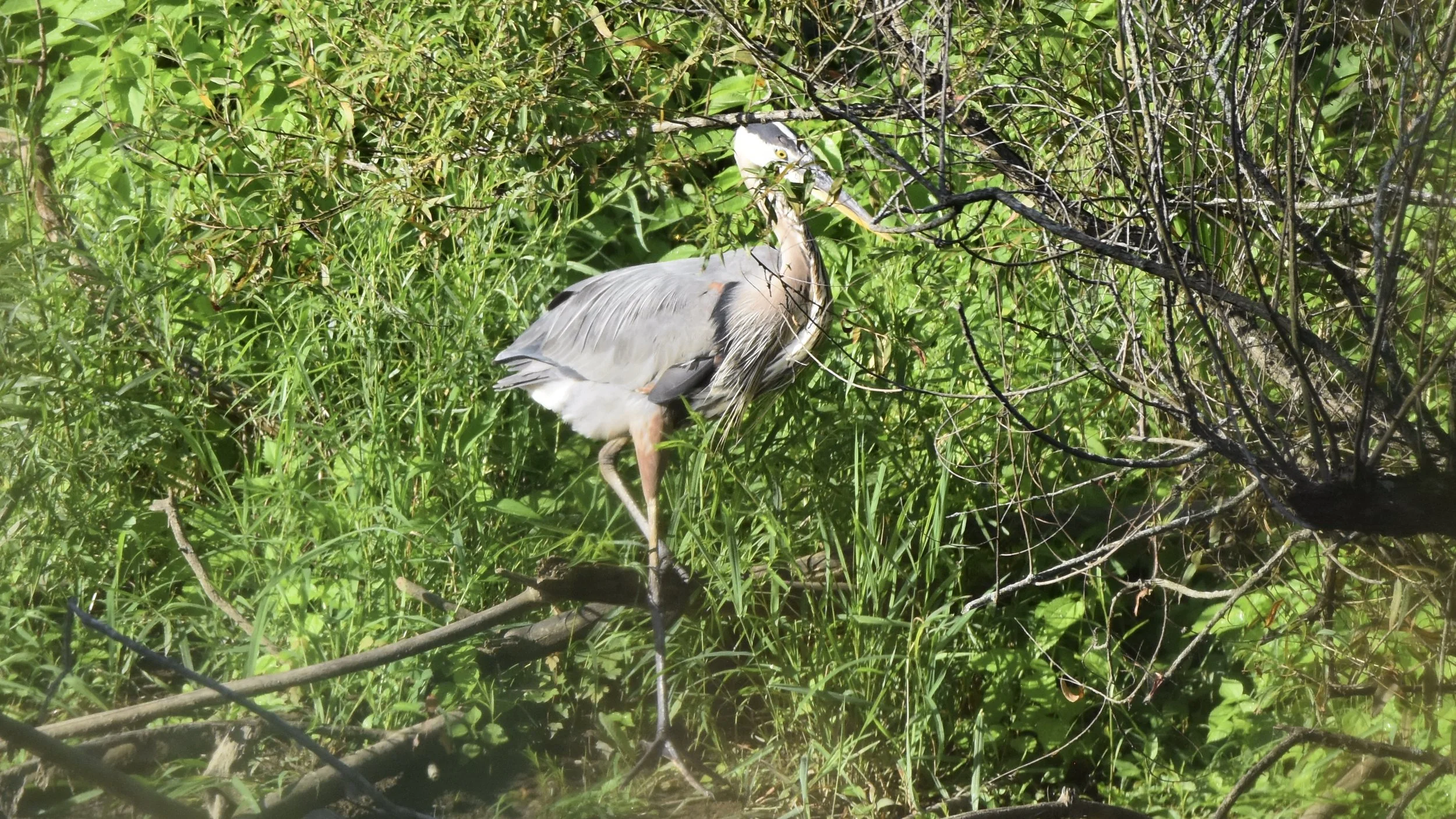 We sure enjoyed watching this Great Blue Heron. He was in one of the ponds at .. several mornings recently. Most days we see him catch a fish. He totally ignores us when he is focused on lunch.