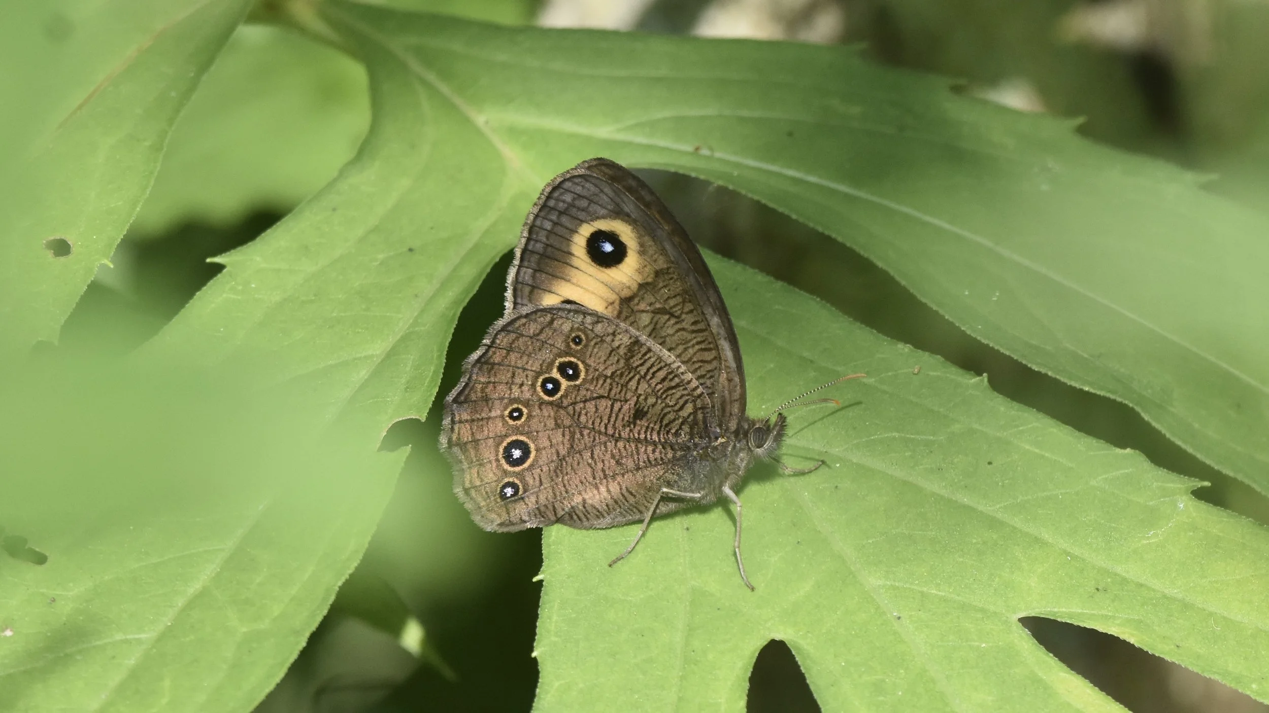 This is a Common Wood Nymph Butterfly. I have seen a couple of them this year but this is the best photo I have been able to capture. Love all the eyes.
