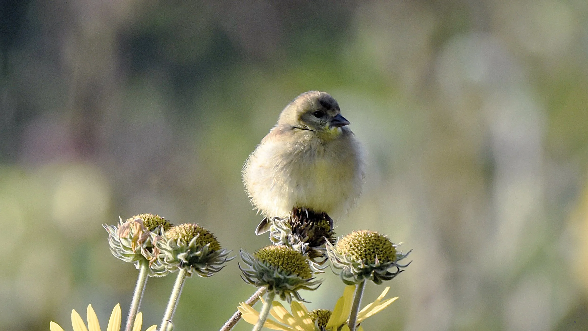 This is an immature American Goldfinch. It looks to be very young. I love this photo.