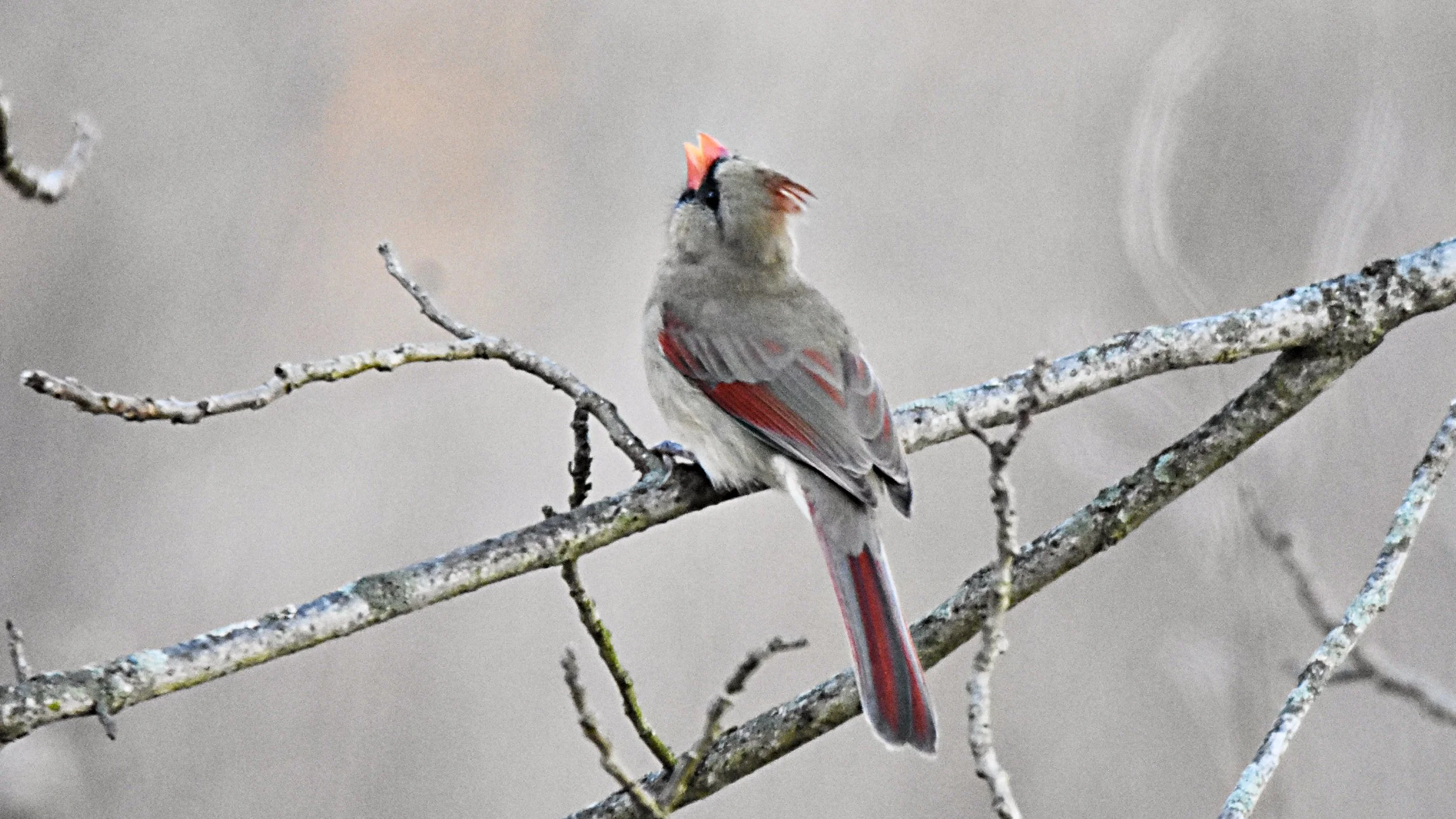 I just love the female Northern Cardinal .. and this one was looking up a a sparrow on the branch above her. The colors are beautiful.