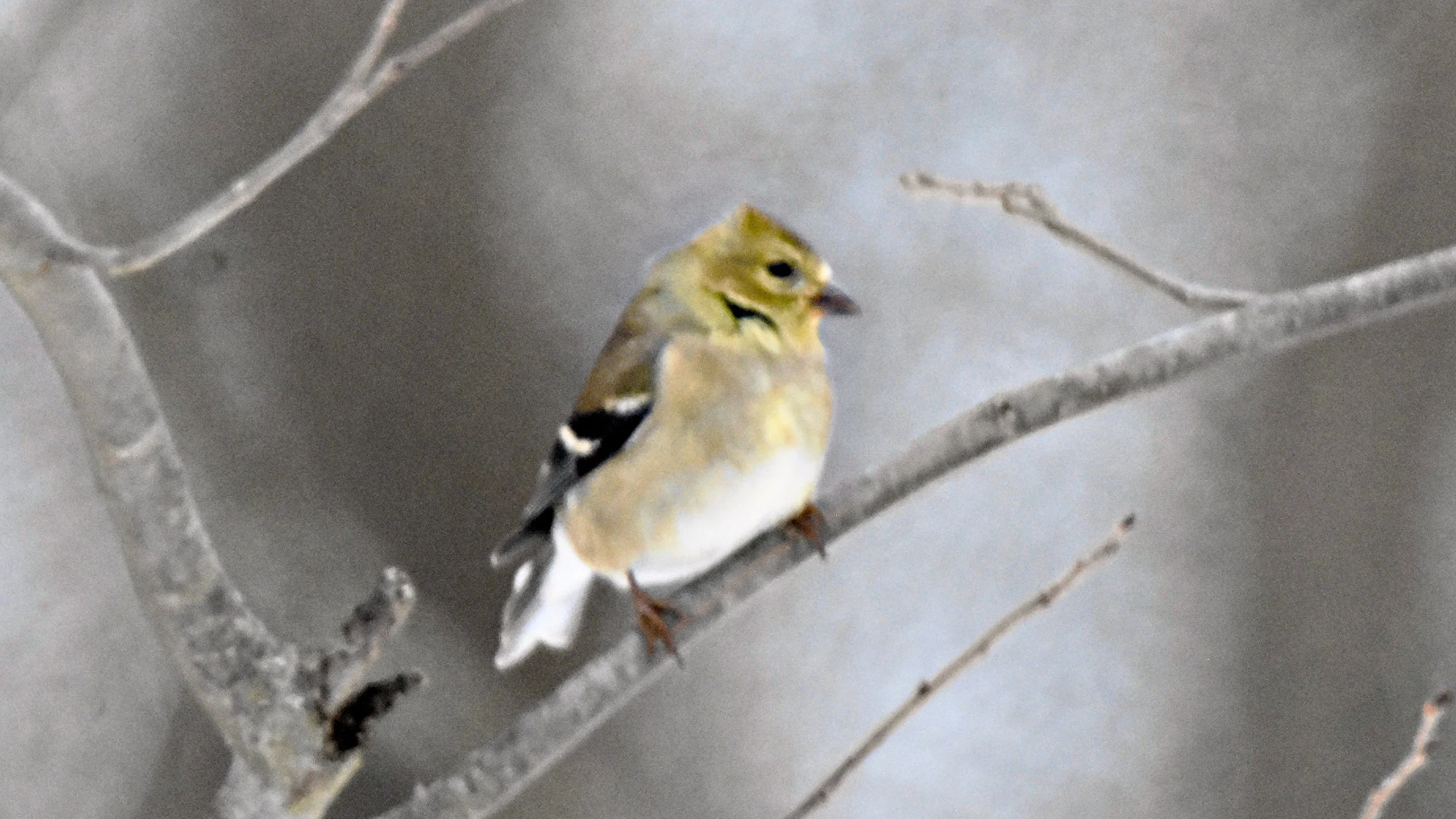 This is not a great photo due to the overcast skys but it is a rare winter photo of a American Goldfinch. It won't be long before they return.